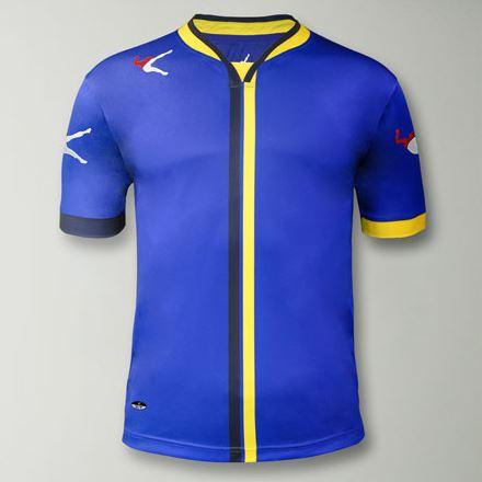 - Legea Trikot Beira royalblau mit je einem senkrechten Streifen in dunkelblau und gelb aus 100 % Polyester Polfresh